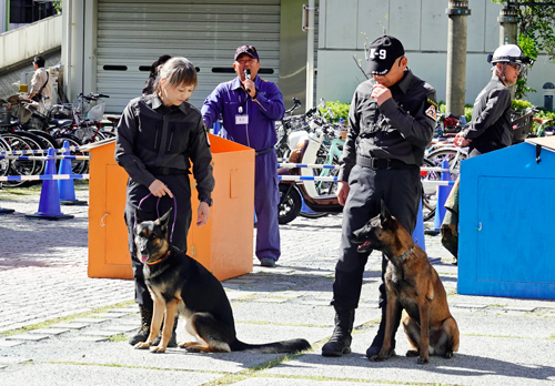 消防本部主催の、災害救助犬の訓練デモンストレーション。シエパード2頭。進行係の説明で、また学んだ。この子たちは拍手が多いと、認められていると励みになる。大きな拍手を。小さな子は、座って見ていると、救助対象者と思うので、立って見てくださいとお願い。