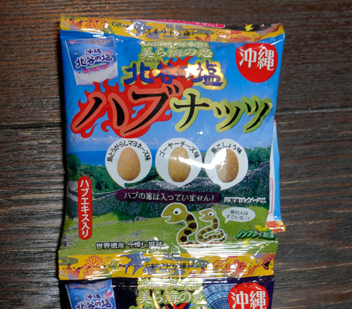 わが家の珍味に、沖縄珍味「ハブナッツ」小袋のネーミング。美ら海の恵み 北谷の塩 ハブのイラスト横には、ハブエキス入り ハブの毒は入っていませんと楽しませてくれます。