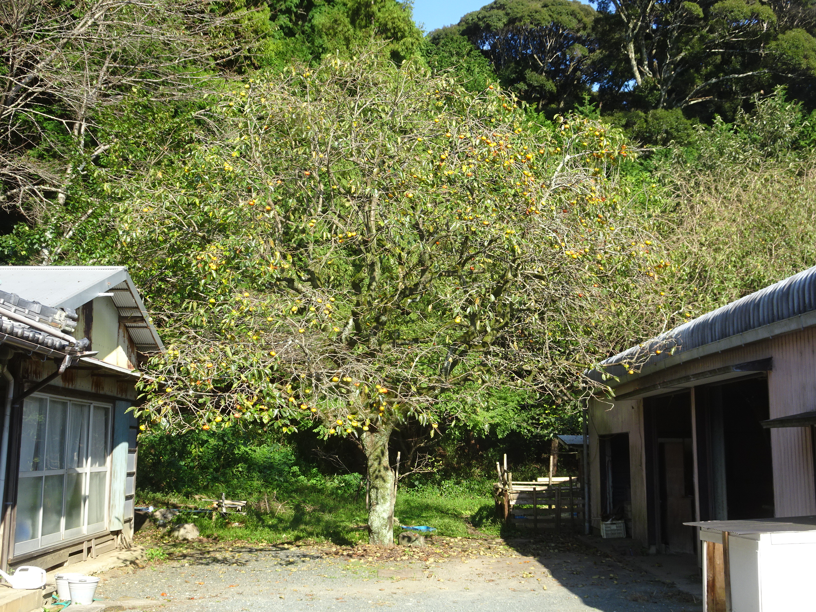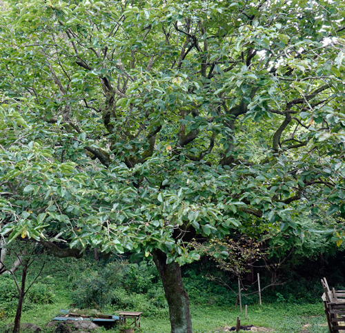 今年の樹には実が一つも生っていない。サルが青いうちに全部食べたり、落としたのです。今までは、サルは青柿を全部食べつくさず残したものですが。