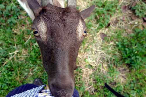 食事が済んだら、腹ごなしに、リードを括りつけている木グイに突進している。叱って、近寄るとこちらに向かって来る。角突きをされるかと思ったら、顔でこちらの全身をスリスリなぜる。照れ隠しかやけにフレンドリー。