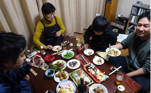 二男帰省し正月のファミリー食事。楽しいひと時。 主役のK太君、カメラに顔を出すのが恥ずかしいのか? 普段はお茶目ですが、男の子も12歳は照れるお年頃か。下を向いている。