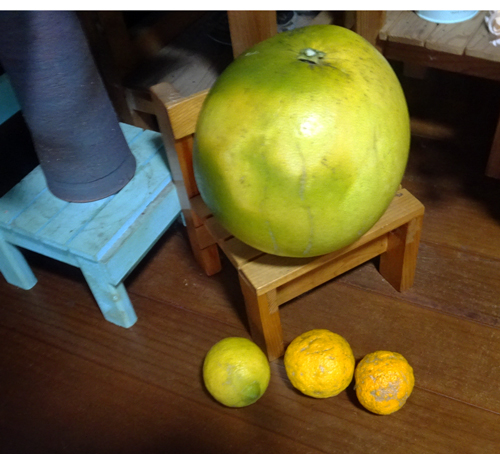世界で一番大きいネズミと言われるが、世界最大級の柑橘 晩白柚(ばんぺいゆ)を頂戴した。比較に、家ユズとレモンを比較に置いた。相当な大きさです。