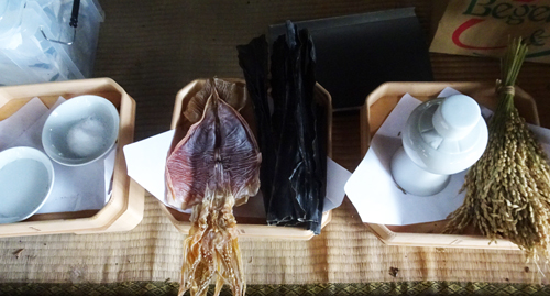 お供えするのは、写真の向かって左から、水 塩 スルメ コンブ お酒 稲穂等。