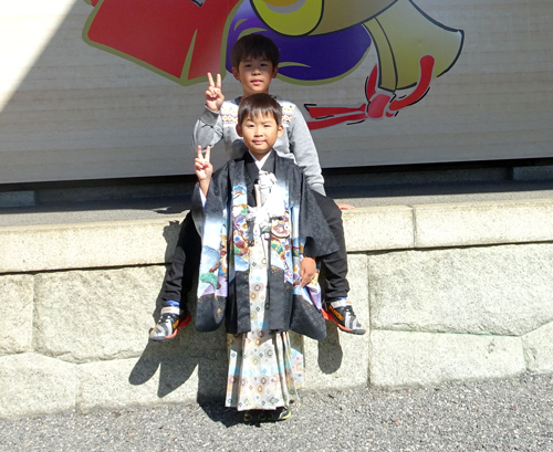 K太君の七五三、砥鹿神社、令和28年の写真です。お兄ちゃんとの写真。二人とも、少年に成長しています。