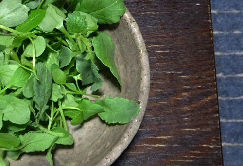そのまま食べると、青菜のえぐさがあるが、ほんの少し、塩をかけず、酢のドレッシングをかけて。この時期しか食べられない、新鮮、強烈な風味です。