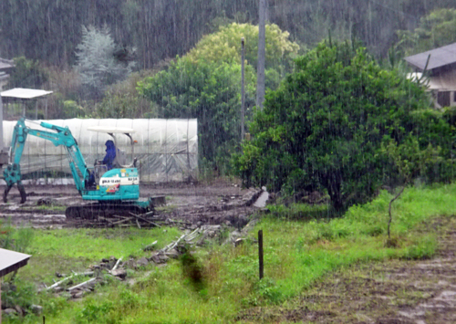 隣家の畑で、ビニールハウスのパイㇷ撤去と整地作業中 作業員5名 猛暑、雨に関わらずしているので、自分には出来ないと驚嘆。慣れているとはいえ凄い。但し、休憩はたくさんとっています。