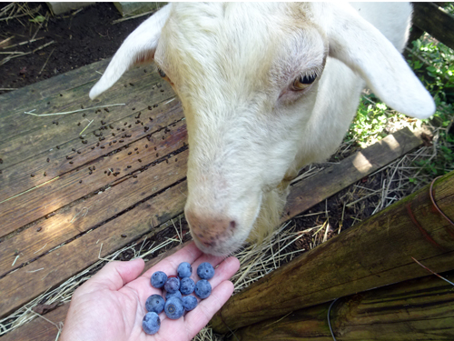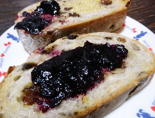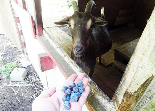 家の畑で摘んだ実と。砂糖、ハチミツでブルーベリージャムを作る。砂糖控えめ、甘みが薄くてよい。