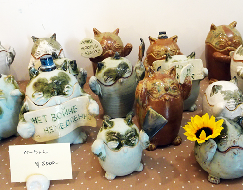 ウクライナ語で戦争反対と描いた小皿と、ネコのベーにゃんも、プラカードを持っています。作家は、私に何か出来ることはと思い、陶器にメッセージを込めましたと語っていました。面識あり、心根の優しい人です。