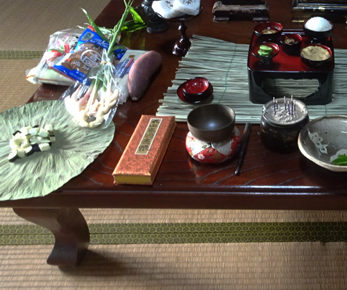 住職が家に来て、お経を唱える、わが家の行事です。お供物は野菜たくさんです。