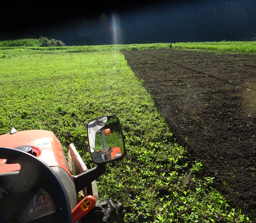 夏になるにつれて、草が繁り、畑内はトラクターを撹拌。
