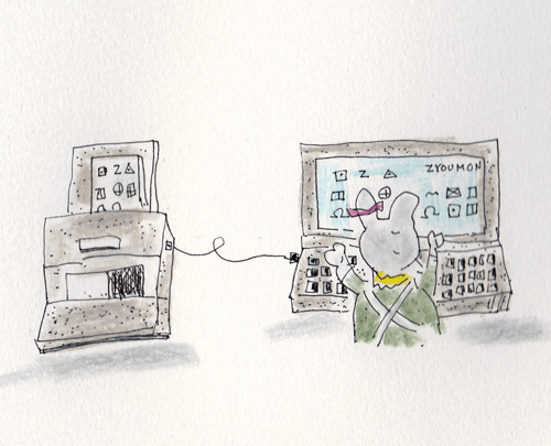 縄文のうさぎが、石でできたパソコンを操作しているイラストです。自称 縄文パソコンと称しています。