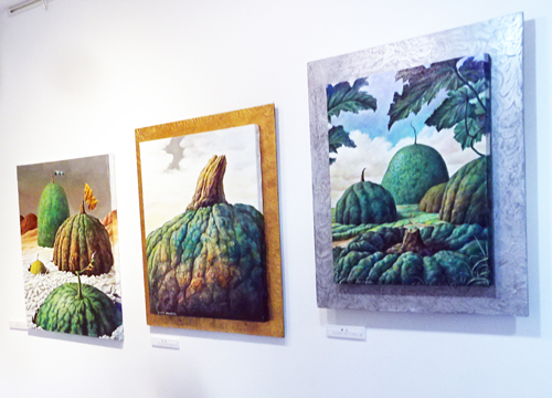 画家とは面識あり。来訪時 在廊で20分余、絵を見ながらお話し。楽しいひと時。カボチャ、スイカの絵多数で、カボチャの画家として著名。教員の傍ら描き続け、ダリに感銘をうけて、シュールレアリスムな絵を描いています。緻密かつ不思議な世界です。シュールは、非現実 超現実。