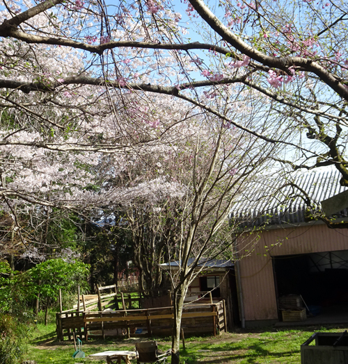樹が2本ありますが、向かって右側の樹高低い方が、本家シダレ桜 左の大木が、枝接ぎをした、二代目です。